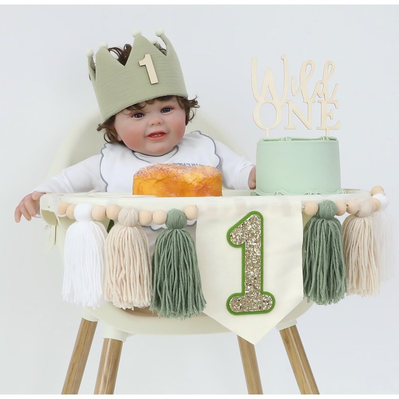 Wild One High Chair Banner For 1st Birthday Party Boy Decorations With Green Tassel Garland Crown Hat Wild One Cake Topper
