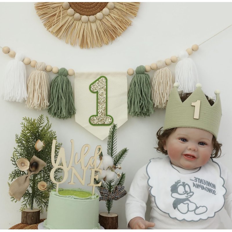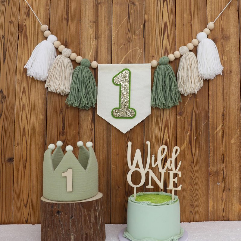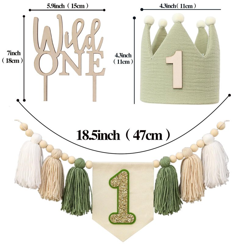 - Package Content: a tassel garland banner containing white beige dark green with the number “1” and wooden beads; a green crown hat, a cake topper; package products in beautiful colors; to create a minimalist; natural atmosphere; very suitable for the jungle theme
