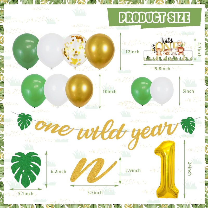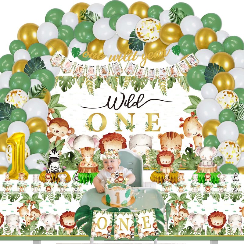- WHAT CAN YOU GET IN PARTY: Our Jungle birthday party decorations set includes 1 Wild One Backdrop, 24 Cupcake Topper, 24 Cupcakes Wrappers, 85 Pcs Latex Balloons (9 Styles), 4 Jungle Centerpieces, 6 Foil Balloons, 1 Highchair Nanner, 1 one wild year Banner, 1 Photo Banner, 8 Palm Leaves, 1 Cake Toppers, 1 Crown, 1 Poster, 1 Tablecloths.
