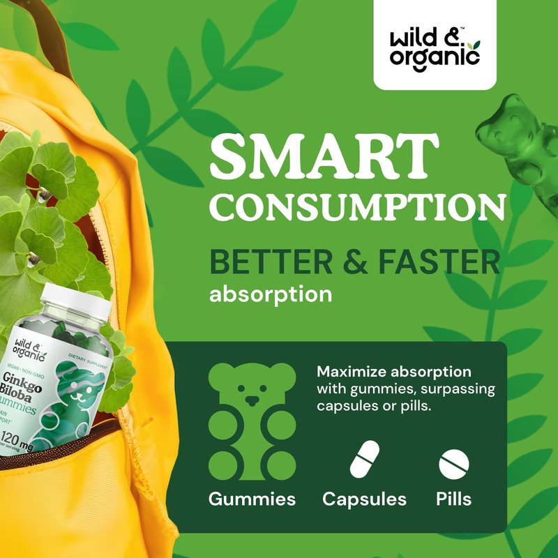 Wild & Organic Ginkgo Biloba Gummies - Brain Supplement & Mental Support Gummy for Better Mood & Focus - Energy Booster Herbal Supplements - Vegan Non-GMO - 120mg, 60 Chews