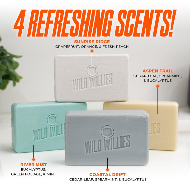 - π π₯πππ₯ππ¦πππ‘π ππππ§ ππ’π₯ π ππ‘: Give the gift of confidence with Wild Willies Men's Moisturizing Soap Bar in four refreshing scents: Coastal Drift, Aspen Trail, River Mist, and Sunrise Ridge. Perfect for men seeking skincare that washes away sweat, dirt, and body odor, ensuring freshness, cleanliness, and confidence all day long.
