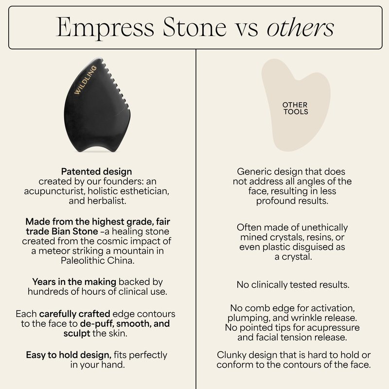 The Empress Stone is Wildling's patented facial gua sha tool designed to lift, sculpt, tone, and de-puff the skin. Unlike other gua sha stones, the Empress is composed of Bian stone, an amalgamate of 40+ minerals known for their healing properties. Each stone is hand made in a specialized factory focused on quality. Each edge of the tool is intentionally architected to enhance the practice of facial gua sha, one must be very careful what tool you use on your face. Known for its rejuvenating properties, Bian stone formed when a meteor struck a mountain in China 65 million years ago. This stone emits measurable ultrasound pulsation, a far-infrared wave, and emits negative ions — all of which are known for their antioxidant and anti-aging benefits. Many Gua Sha stones are not made with the same care and quality.