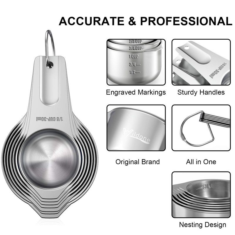 - ⭐ [WELL-CRAFTED HANDLES] Wildone metal measuring cups are upgraded to one piece construction, so the handles will never break off or bend easily. The premium quality make this super easy to clean, just put them into the dishwasher.