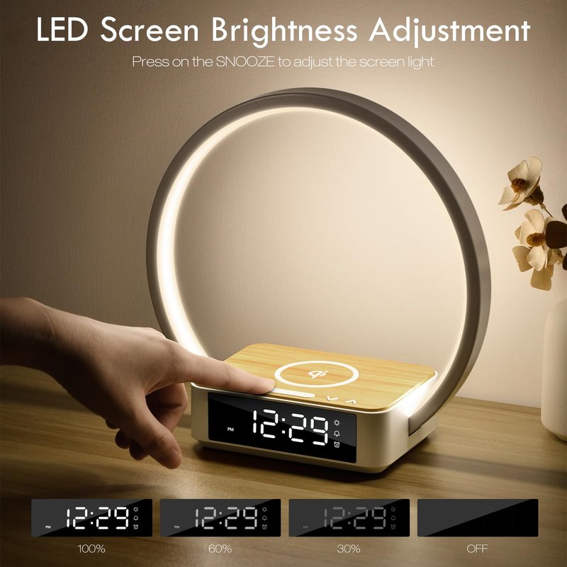 - š”ć3 LEVELS BRIGHTNESSćThe desk lamp has three brightness levels - low, medium and high to meet all needs for use, work, study, and relaxation. The light is bright, warm and soft, does not dazzle and provides warm care in the dark. ALSO, THE BRIGHTNESS OF THE CLOCK DISPLAY SCREEN CAN BE ADJUSTED, SHORT PRESS THE " SNOOZE" BUTTON TO ADJUST THE BRIGHTNESS OF THE DISPLAY SCREEN.