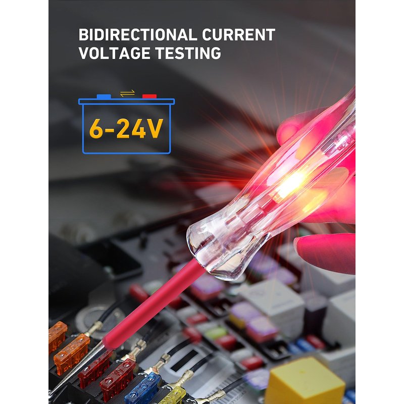 - [Wide Application] Professional automotive circuit tester/circuit test light with 6-12-24V DC voltage testing range, ideal for checking various vehicles' electrical circuits. Quickly test automotive headlights, taillights, turn signal circuits, faulty sockets, fuse connections, also suitable for testing other 6-24v DC wirings and circuits