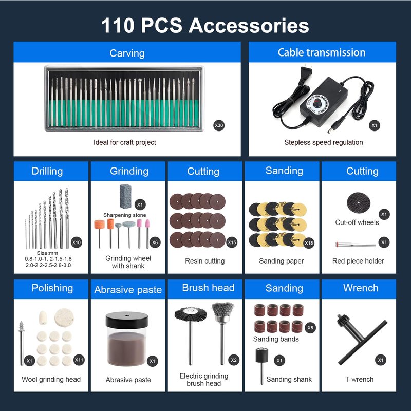 - 【More Accessories】 The resin polishing kit comes with 110 accessories, including twist drill, sanding needles, cutting blades, wool wheels and brush heads, etc., which can meet your different DIY needs, not just drilling holes