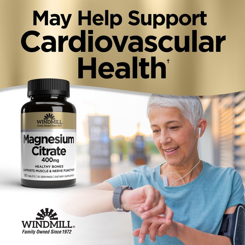 Windmill Natural Vitamins Magnesium Citrate 400 mg, Immune Support, Supports Muscle Recovery, Supports Healthy Heart, 60 Count, 30 Servings