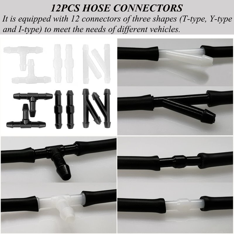 - Package Included: 1 x 4M windshield washer hose + 12 x windshield wiper hose connectors (including three types: 4 x T type; 4 x Y type; 4 x I type).