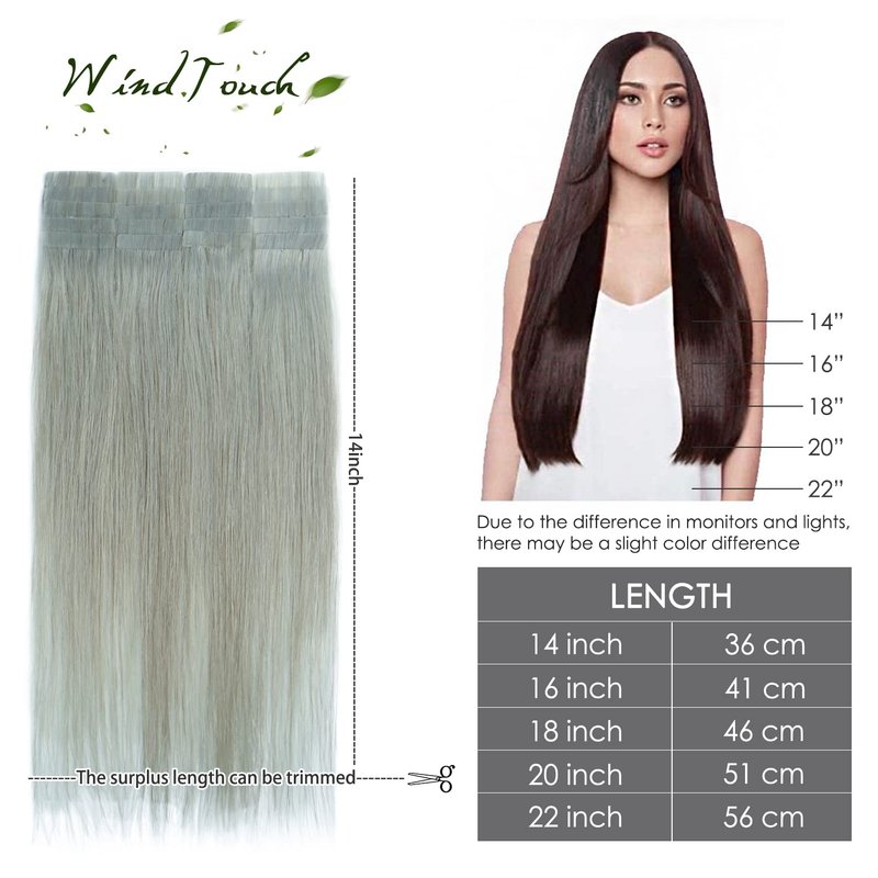 - Specification: WindTouch tape in hair extensions human hair are 14-22 inch, 20 pieces each pack. 14 and 16 inch weigh 30g, 18 inch weigh 40g, 20 inch weigh 50g, 22 inch weigh 60g, 20 pieces per pack. If you have thick hair, we recommend purchasing 2-3 packs to achieve a perfect result.