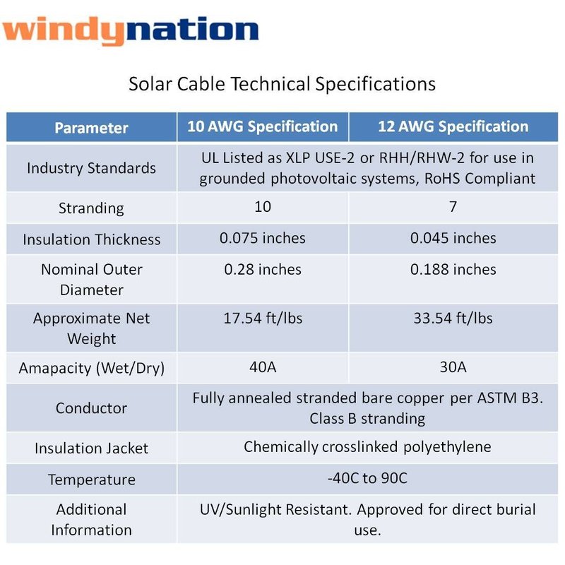 - SEE IMAGE #2 in the photo gallery for 10 AWG and 12 AWG solar cable specifications