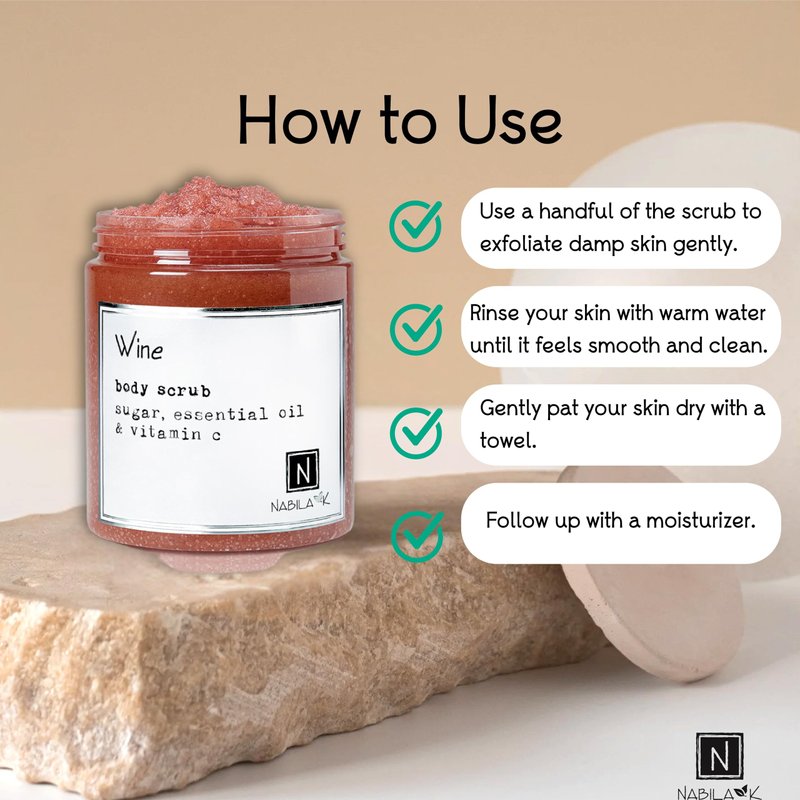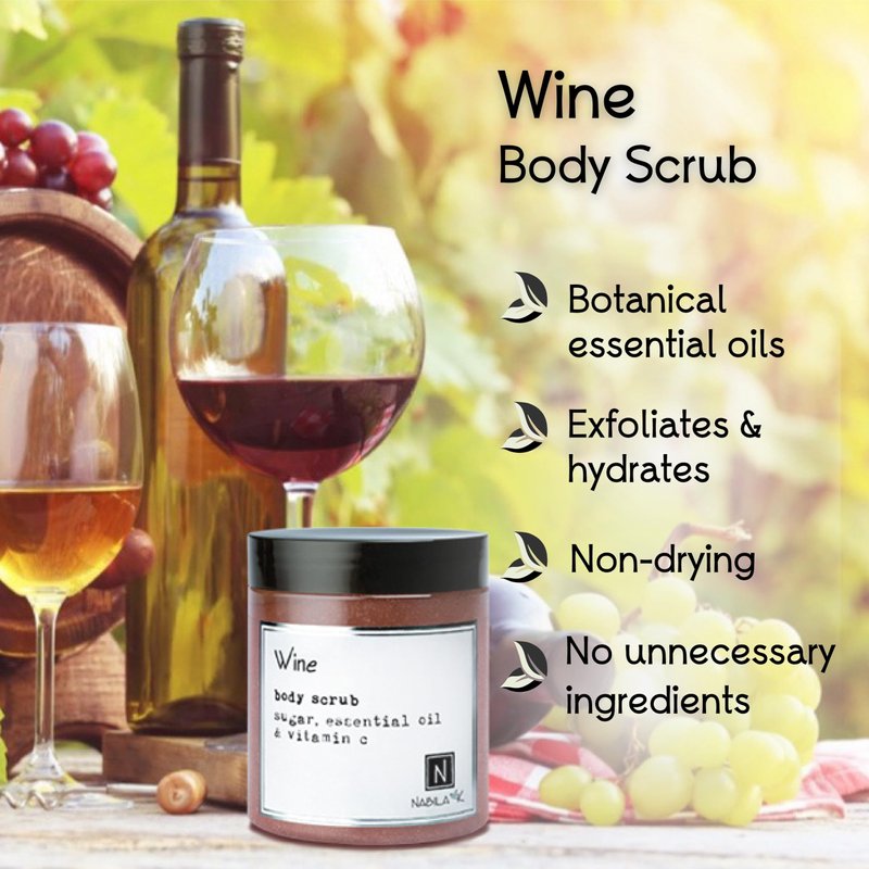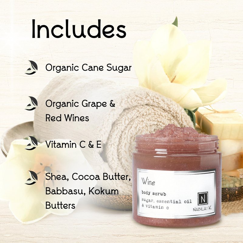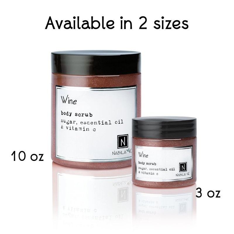 Wine Body Scrub Made in USA with Essential Oil and Vitamin C by Nabila K - Exfoliate and Moisturize for Smooth Skin - Luxury for Women & Men, 3 oz