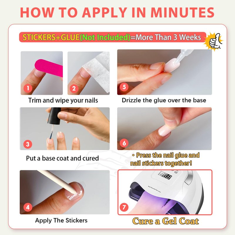 2.Please note that the nail glue is not included.If you want it last for a longer time,please use nail glue instead of the nail stickers.