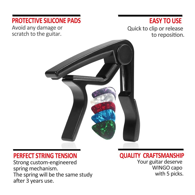 WINGO Guitar Capo for Acoustic and Electric Guitars with 5 Picks for Free, Black.