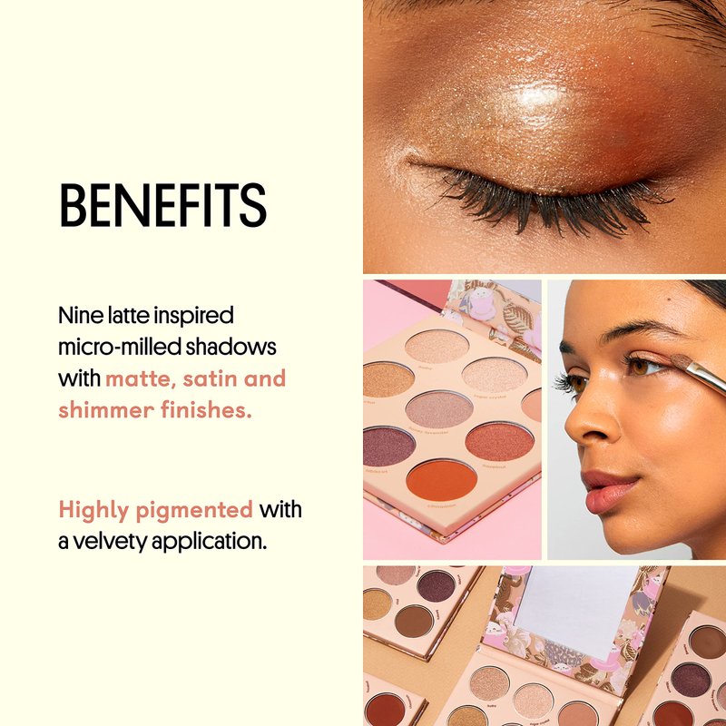 - Eyeshadow Palette: Featuring 9 shades in matte, satin, and shimmer finishes will take you from your first latte to your last espresso.
