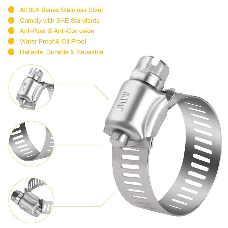 - Premium Materials: WINL SAE 16 hose clamps of 19mm-38mm are all 304 stainless steel ( including band, housing and screw) to provide maximum corrosion resistance to salt and most chemicals. The worm drive hose clamps comply with SAE standards. WINL stainless steel hose clamps are salt resistant, anti-rust, anti-corrosion, water proof and oil proof; WINL hose clamps are reliable, strong, reusable and durable.