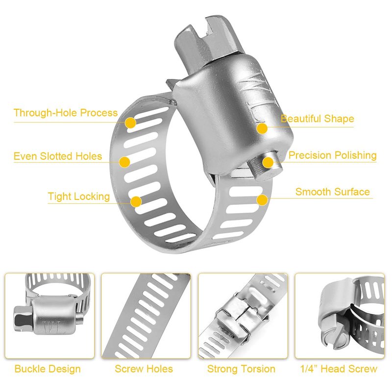 - Effortless Installation: Winlong hose clamps are designed with through-hole process, even slotted holes, steel belt through hole, tight locking and strong torsion force. The stainless steel hose clamps have stronger tightening force and and easy to install. Winlong worm gear hose clamps are beautiful shape, precision polishing with smooth surface without burrs.
