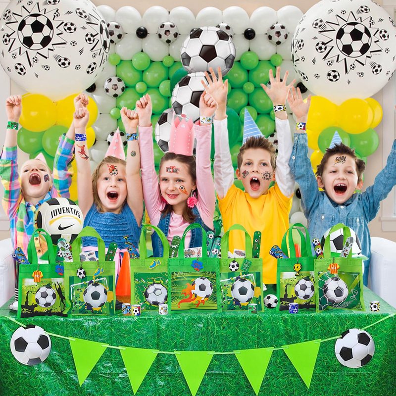 - Soccer Birthday Party Favors - It's soccer time! Our set of soccer party favors are packed with fun and practicality. The soccer non-woven bag has a large capacity, which allows children to carry items easily. Keychains have different shapes. Stickers and slap bands catch kids' attention instantly. Whether you're celebrating a birthday, hosting a tournament, or just getting together with friends to watch games, these party favors will add an extra element of fun and excitement to your event