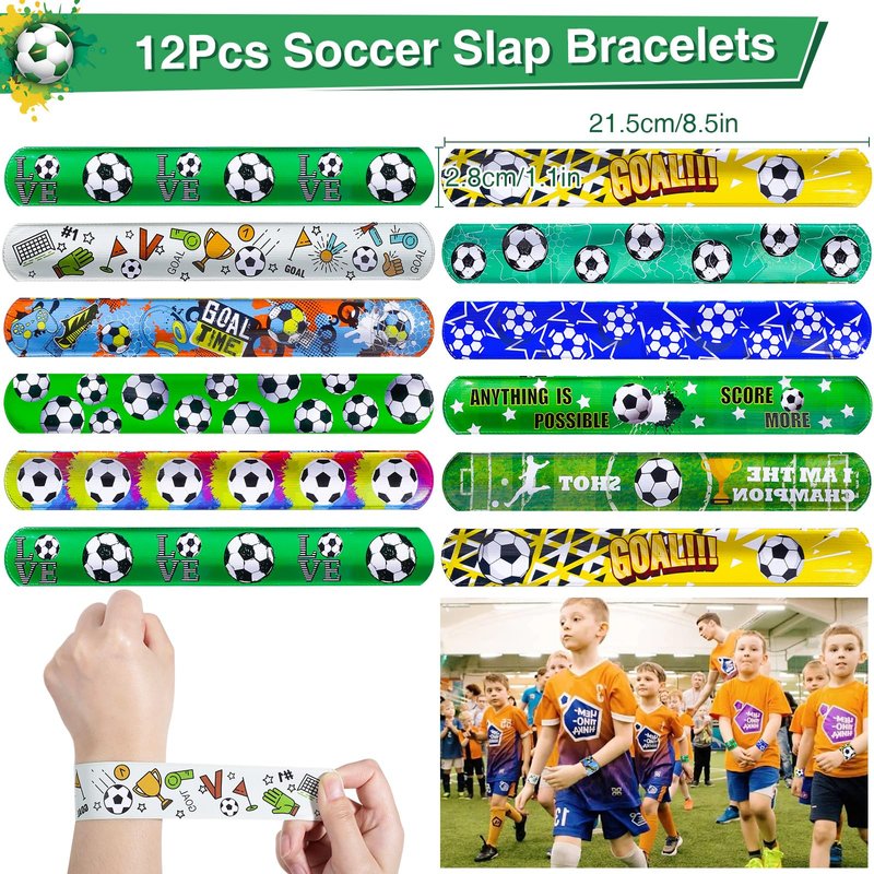 - 48Pcs Soccer Party Favors Supplies - You will get 12 non-woven soccer goodie bags, 12 soccer keychains, 12 soccer temporary tattoo stickers, 12 soccer theme slap bands. From personalized soccer treat bags to stickers, these favors will not only add to the decor, but also provide your guests with a keepsake. Your kids, especially those who like to play soccer, will love these fun and unique soccer gifts. Make your soccer party unforgettable with these amazing soccer party favors
