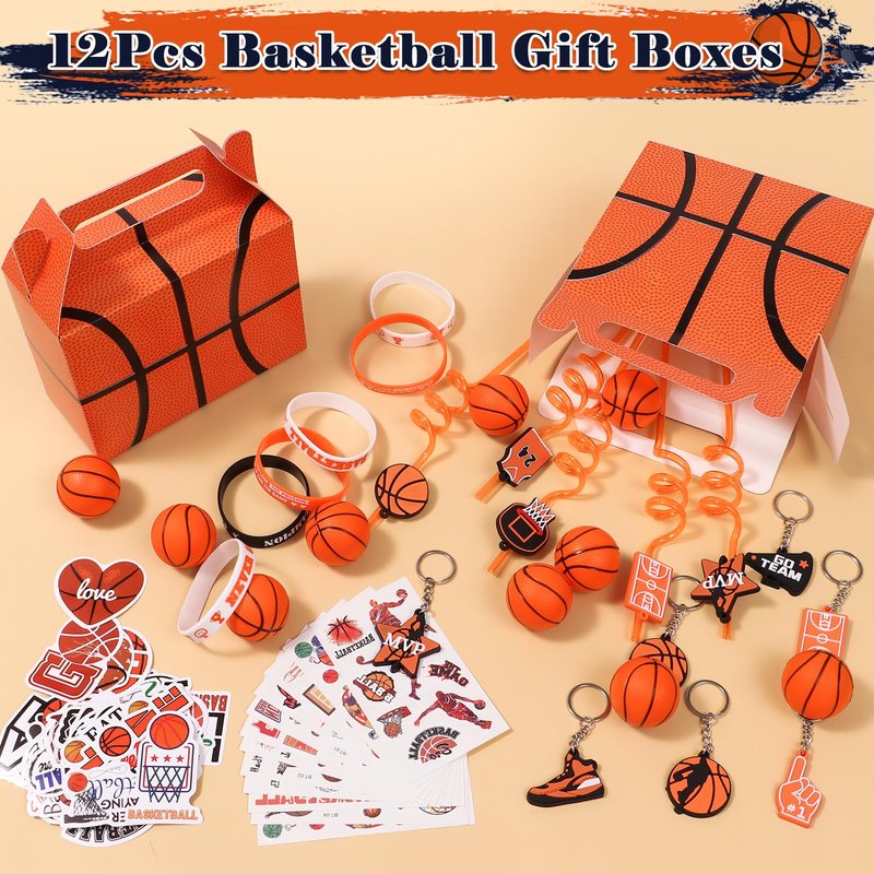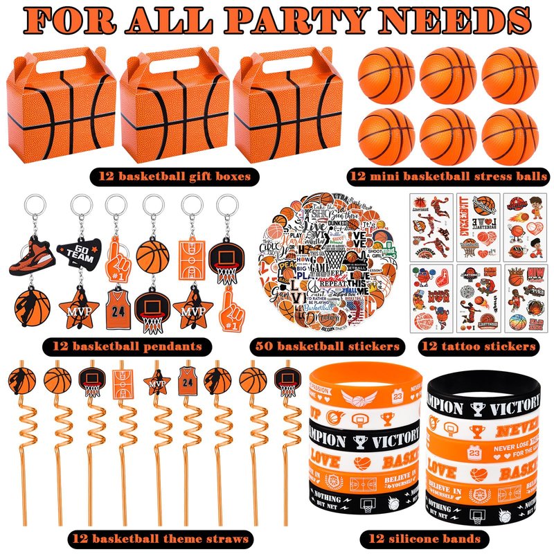 - 122Pcs Basketball Party Favors Supplies - You will get 12 basketball gift bags, 12 basketball theme straws, 12 mini basketball stress balls, 12 basketball key decor, 12 tattoo stickers, 12 silicone items, 50 basketball stickers. From personalized basketball straws and mini basketballs to basketball goodie bags and stickers, you will love these fun and unique basketball gifts. Make your basketball party unforgettable with these amazing basketball party favors