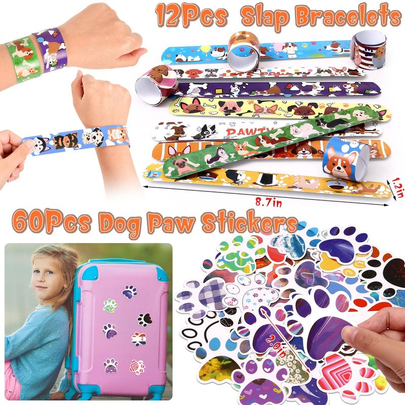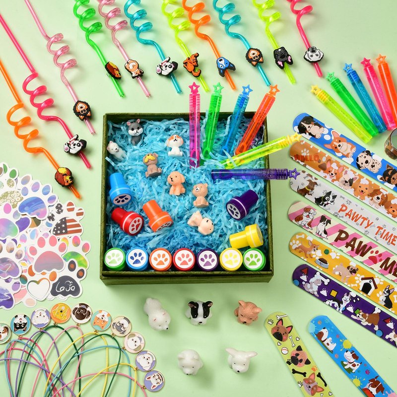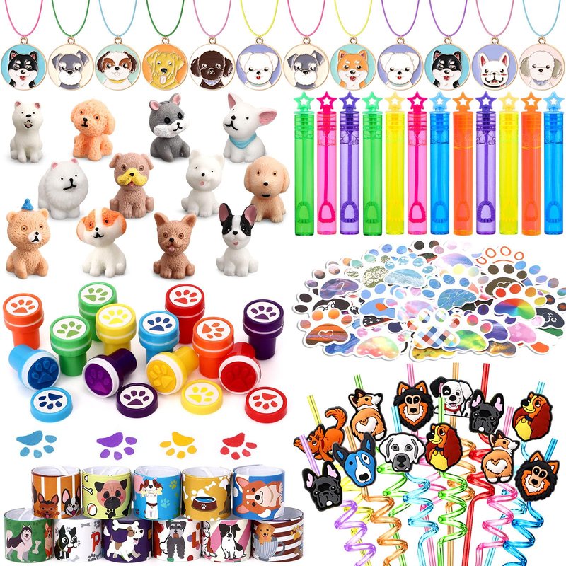 - 132Pcs Dog Party Favors - Unleash the fun with our paw-some dog party favors! You can get 12 dog straws, 12 dog figures, 12 dog necklaces, 12 mini bubble wands, 12 paw print stamp, 12 slap bracelets, 60 dog paw stickers. From our selection of dog straws and necklaces to personalized dog figurines and dog-themed slap bracelets, our dog gifts will make boys and girls very happy. Don't wait - fetch these fantastic dog party favors now and give your kids an unforgettable dog party