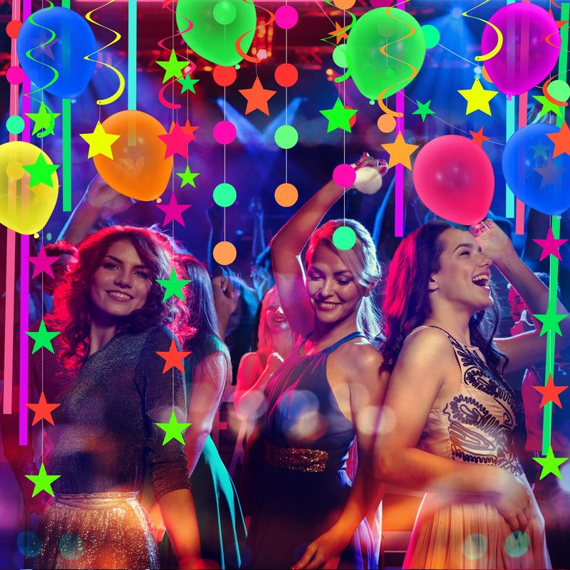 - Glow Neon Glow in The Dark Party Supplies: You can get 82 neon balloons (6 colors), 10 hanging swirls, 4 crepe paper streamers, 1 dot garland (4m), 1 star garland (4m), 1 strip garland (2m) ; 1 balloon chain, 1 roll of ribbon, 3 sheet glue point stickers. This is a set of glowing party decorations suitable for any age, it can be used in family gatherings, birthday parties, weddings and other occasions, let's enjoy the party feast together