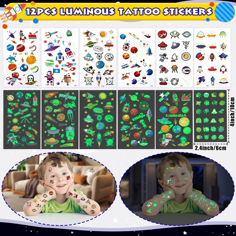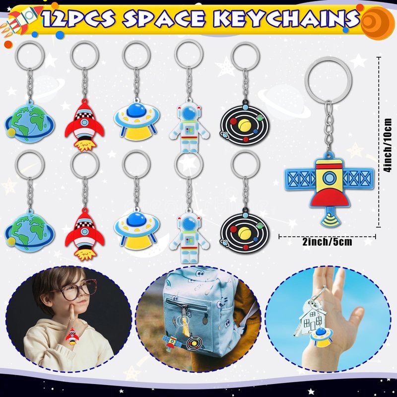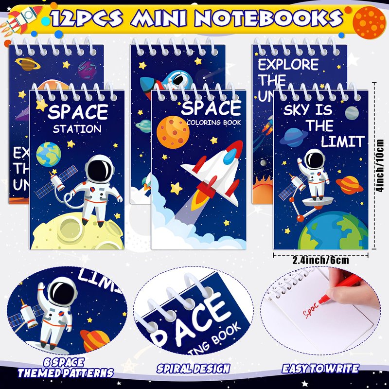 - 60PCS OUTER SPACE PARTY FAVORS KIT - We offer 12 space themed small spiral notepad (6 types), 12 invisible ink pens with uv light for kids (purple, blue, green, yellow), 12 luminous glow in the dark tattoos, 12 astronaut rocket keychains, 12 space stampers. This is a very interesting set of space themed party favors, which can be shared with 12 good friends at once. Let’s travel among the galaxy with our space birthday party favors for an unforgettable space-themed party