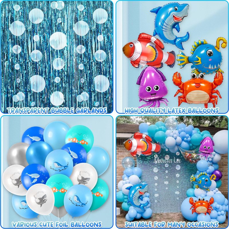 - Unique Design & Premium Quality - Our under the sea party decorations are carefully designed with a captivating ocean blue color scheme. Latex balloons and foil balloons, both with cute ocean sea animal patterns, are highly elastic and not easy to break. The fringe curtains made of sea blue PTE have a shiny finish and can be easily adhered. The bubble garland kit consists of translucent, beautifully printed plastic sheets that are more durable and lighter