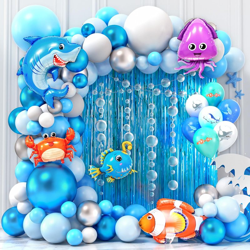 - 125Pcs Dreamy Under the Sea Party Decorations - You will get 99 latex balloons (5''+10''+18''), 12 ocean animal printed balloons (12''), 8 large sea animals foil balloons (2 sharks, 1 octopus, 1 lanternfish, 1 crab, 1 clownfish, 1 starfish, 1 squid), 2 blue fringe curtains, 1 bubble garland, 100 dots, 1 roll ribbon (10 m), 1 balloon arch strip (5 m). Such an abundance of ocean party decorations provide a completely immersive ocean experience that will impress your kids