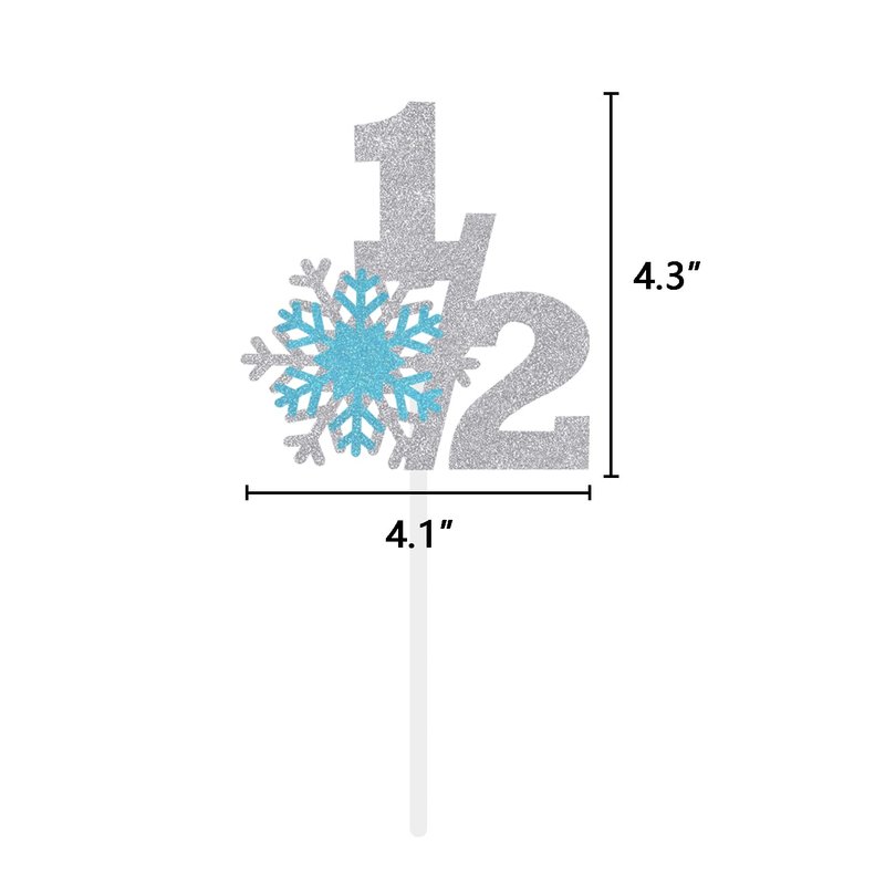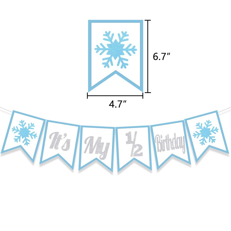 - Each flag on the snowflakes 1/2 birthday garland measures about 4.7" in length, 6.7" in height. The glitter snowflakes half birthday cake topper measures about 4.1" in length, 4.3" in height.