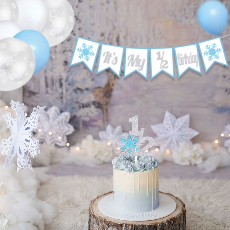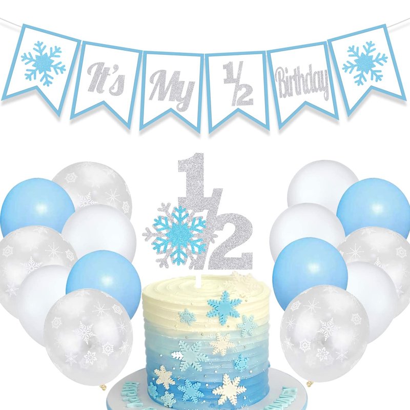 - The blue snowflakes winter banner comes with ribbon, easy to assemble. The party decoration set include 1 It's my 1/2 birthday banner, 1 half birthday cake topper, 15 balloons(5 of each color)