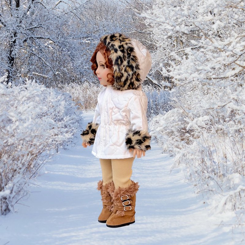 - Ivory parka with leopard faux fur trim around the hood and sleeves with beige leggings and winter boots.