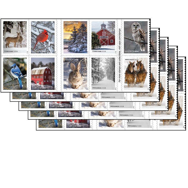 - The 10 different photographs featured in this booklet of 20 USPS stamps showcase the special allure of winter, with iconic scenes from the northern United States.