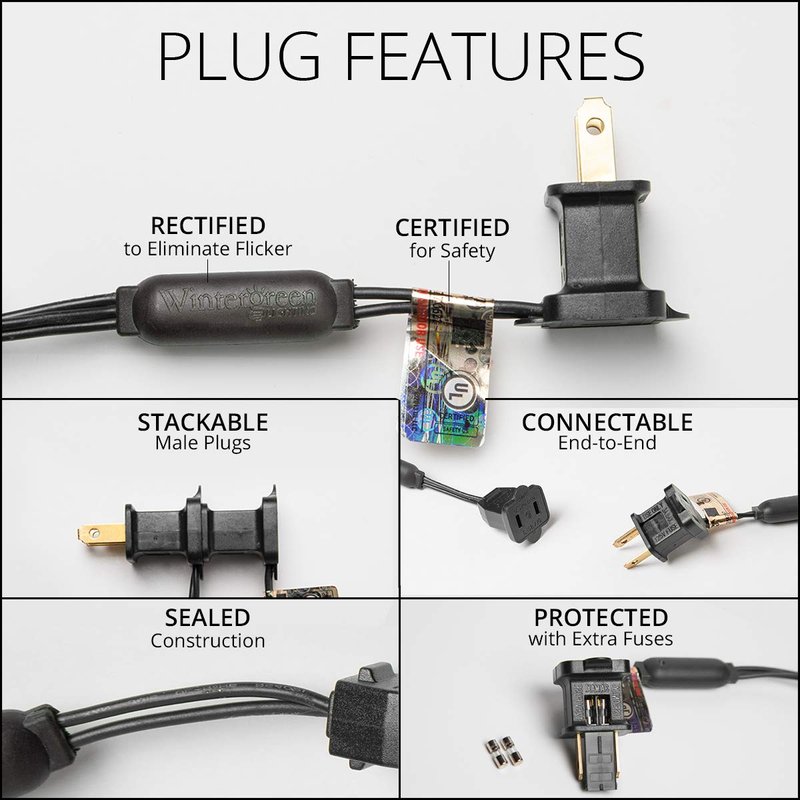 - [ CONNECT 44 SETS ON SINGLE PLUG ] Safely connect up to 44 sets end to end for over 300’ total coverage on one plug - 4.83 Watts (0.04 Amps) per set. 120 volt fused male plug and female plug for end to end connections. Powered by STANDARD 120 VOLT household outlet.