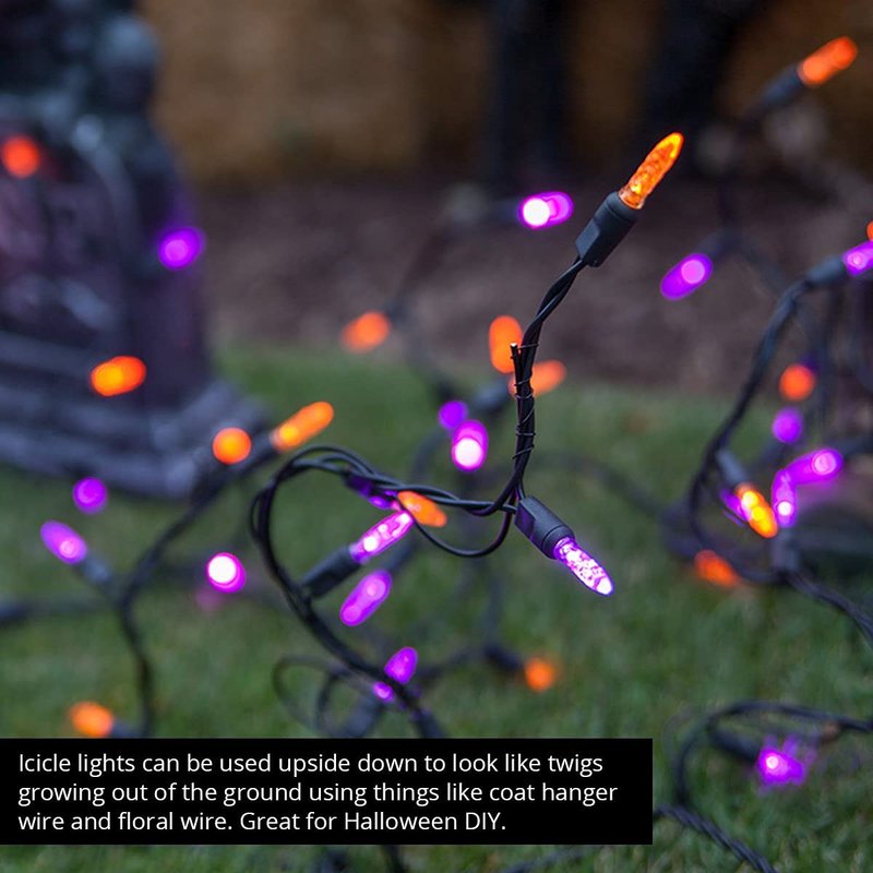 - [ PURPLE/ORANGE LED NON-TWINKLE HALLOWEEN ICICLE LIGHTS ] 70 orange and purple M5 steady LED icicle lights on black wire, 15 vertical drops in lengths of 18”, 15”, and 9”; approximately 7’ lighted string length; 6" lead; 6” tail.