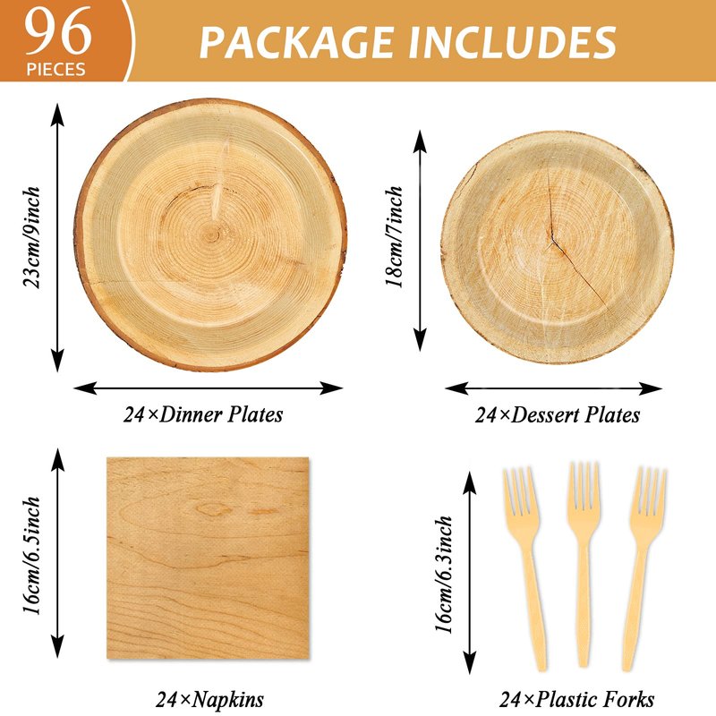 - 【Package Includes】 You will receive 24 pieces of Lumberjack party paper dinner plates of 9’’, 24 pieces Camping Hunting paper plates of 7’’, 24 pieces of Timber Wood Slice napkins of 6.5’’ and 24 plastic forks for each set that can enough to satisfy 24 guests.