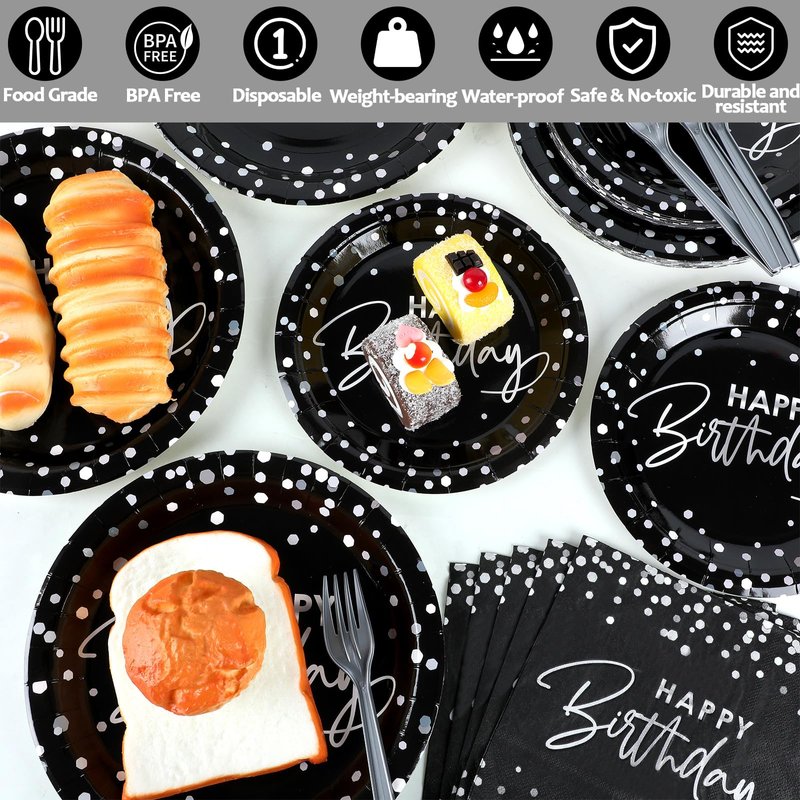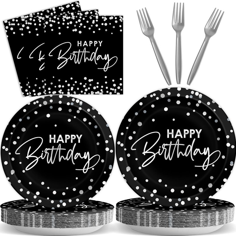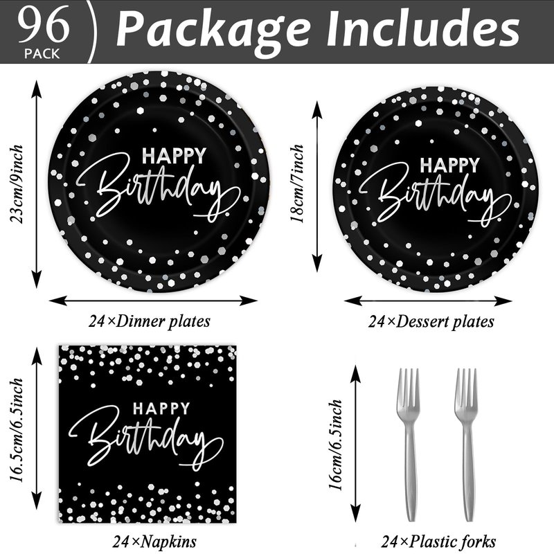 - What you will get: The package comes with 24 sets of black silver birthday party tableware sets supplies, including 24pcs 9inches birthday paper dinner plates, 24pcs 7inches black white silver paper dessert plates, and 24pcs happy birthday paper napkins(About 6.5 x 6.5 inches folded, About 13 x 13 inches unfolded), and 24pcs of plastic forks, totally 96pcs, each set serves for 24 guests. Sufficient quantities are enough for your happy birthday party.