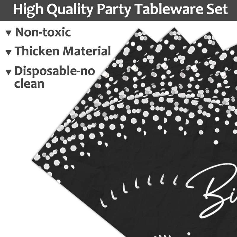 Spice up your birthday party with our black silver birthday party supplies set, which not only adds a practical touch but also features cheerful and delicate prints that will leave an unforgettable impression on your guests.