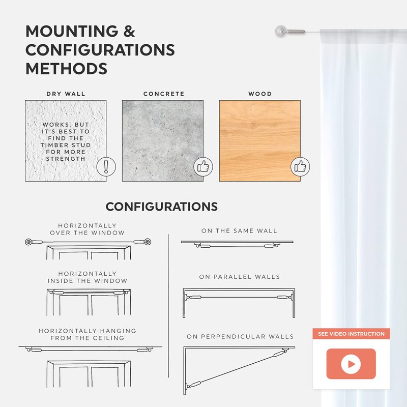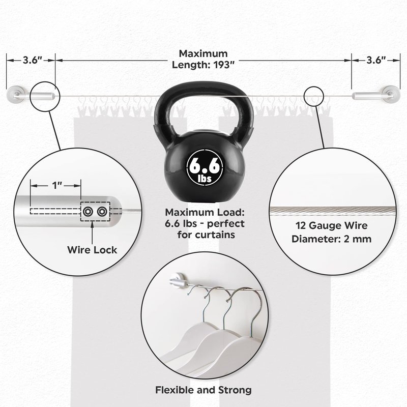 - EXPANDABLE CABLE WIRE - The steel curtain wire in this kit spans up to 16 feet! So, you can use this curtain hanger for windows, sliding doors, and glass walls of any width or style.