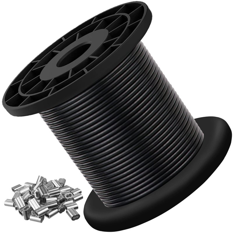Wire Rope 304 Stainless Steel Wire Cable Black Vinyl Coated, Outdoor Light Guide Wire, Suitable for String Lights, Clotheslines, 1/16 Inch Overmolded to 3/32 Inch 100ft