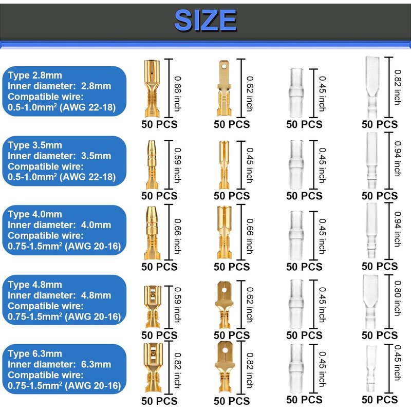 Size: Spades: 2.8mm, 4.8mm, 6.3mm; Bullets: 3.5mm, 4.0mm