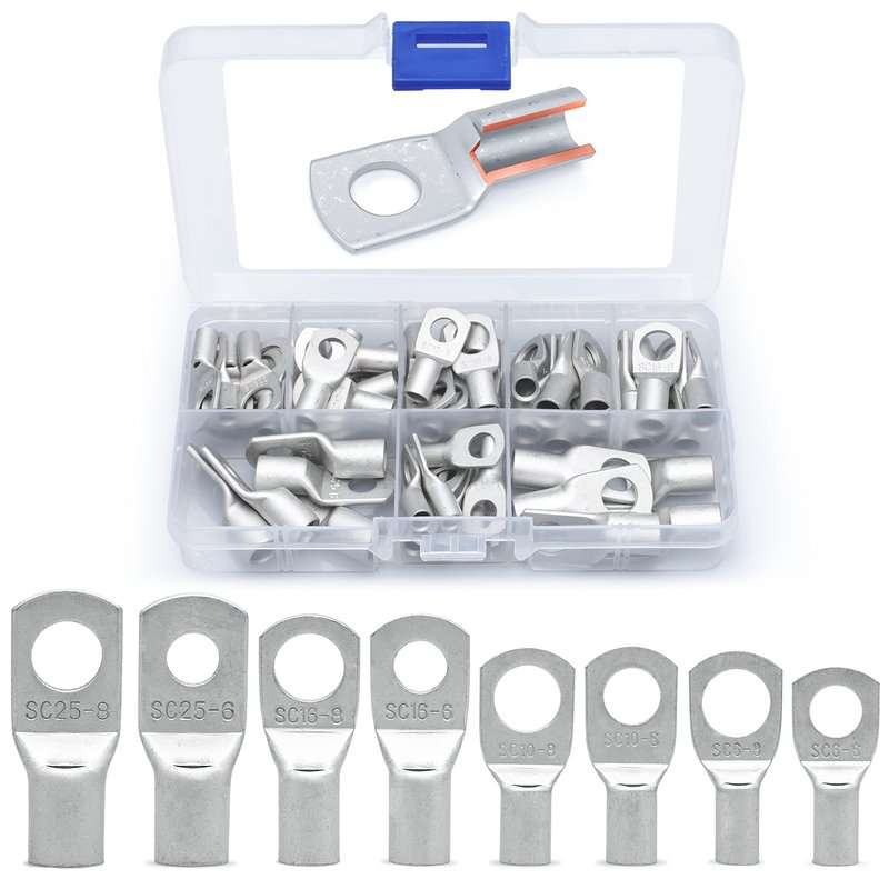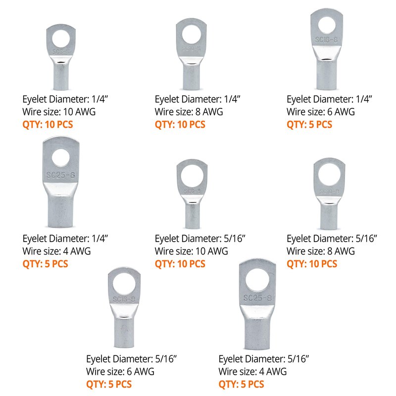 - MOST POPULAR SIZES INCLUDED - This versatile kit of wire lugs will work with 10, 8, 6, 4 gauge wires. We included 1/4" and 5/16" ring eyelets for each wire gauge size.