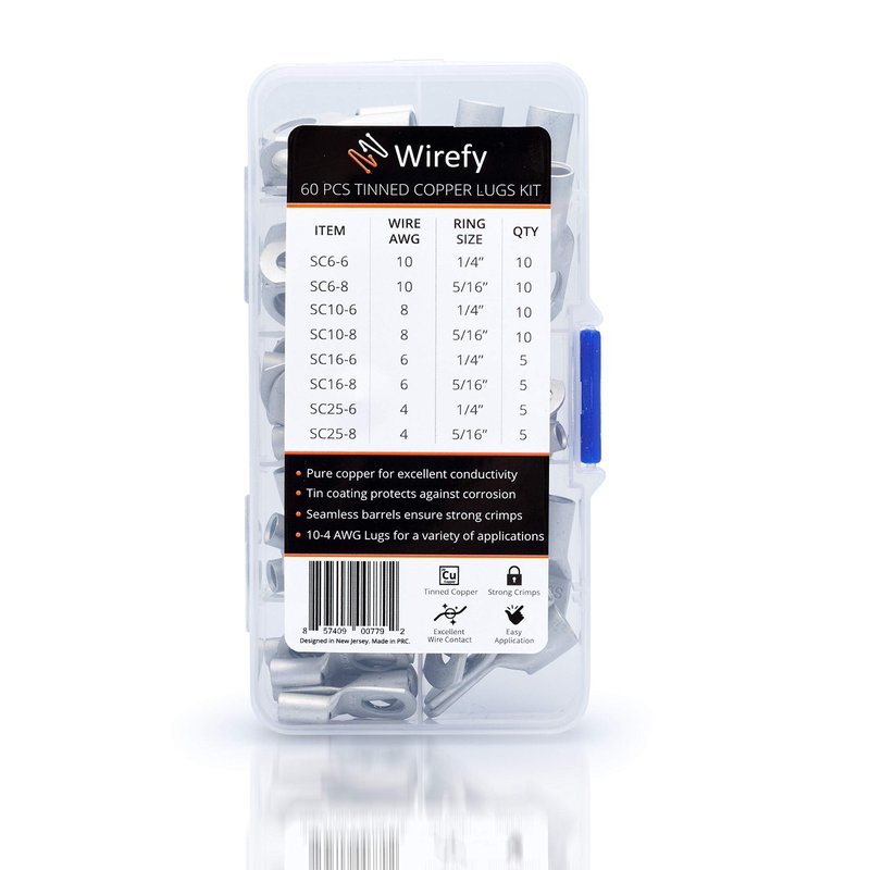 Wirefy 60 PCS Tinned Copper Wire Lugs Kit - Battery Lugs - Crimp Battery Cable Ends - Ring Terminals - 10-4 Gauge