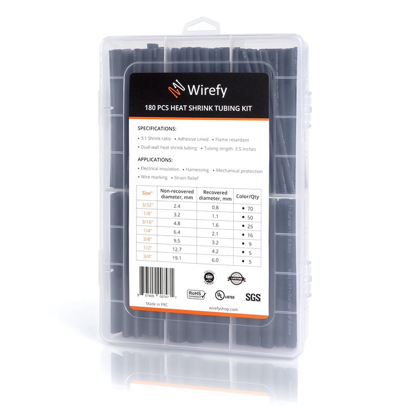 Are you looking to fix a damaged wire, seal out moisture, or provide enhanced strain relief ? Wirefy industrial heat-shrink tubing is an easy to use solution for insulating and protecting wires, cables, connections and components. It can be used in a variety of of applications: marine and automotive wiring, outdoor and home repairs, RC hobbies, or giving your phone charging cable a second life.