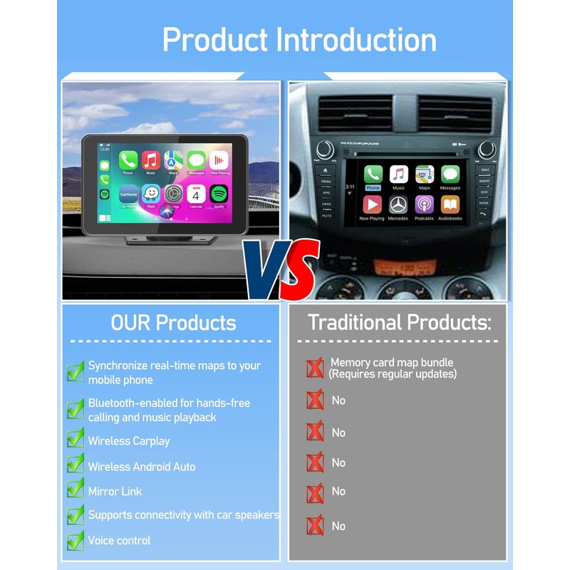 Wireless Car Stereo Compatable with Apple CarPlay and Android Auto,7" HD Portable Bluetooth CarPlay Touch Screen for Car,with Backup Camera