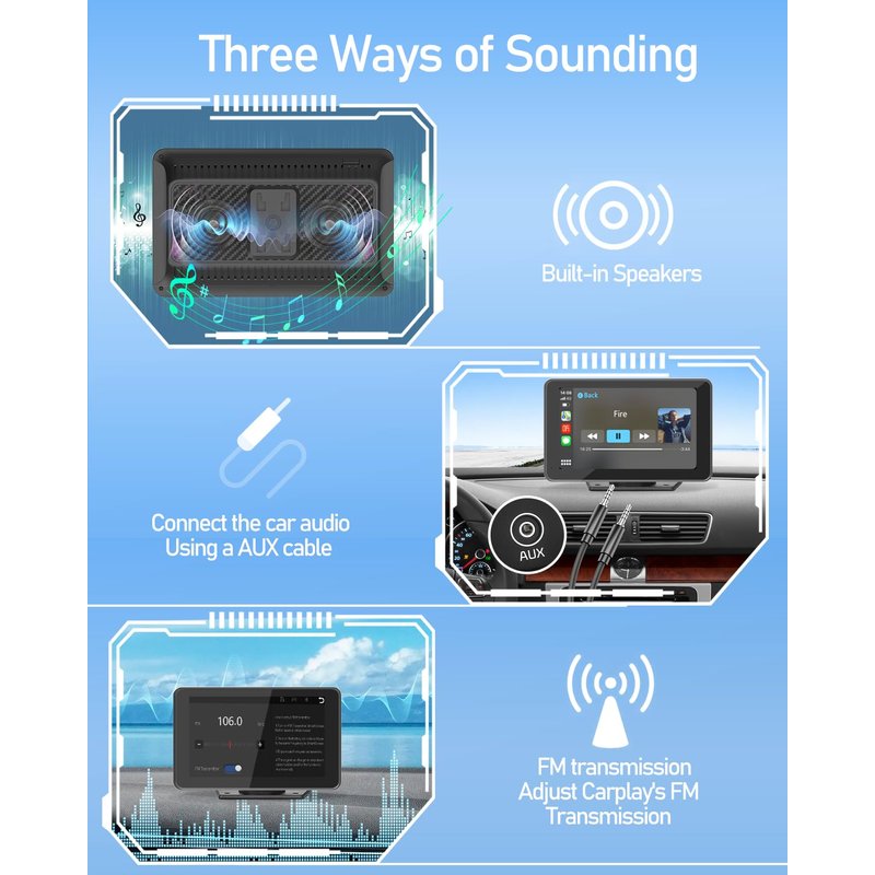 - 【Multiple Audio Output Modes】The portable carplay screen has Bluetooth/built-in speakers, AUX and FM transmitter audio output options. You can use Bluetooth connection to have the sound play by built-in speaker of the carplay stereo, realize Bluetooth speakerphone calls and music playback. You can also play audio through the car's original sound system via the AUX and FM radio options. Freely select radio stations, listen to real-time radio, weather forecast, news.