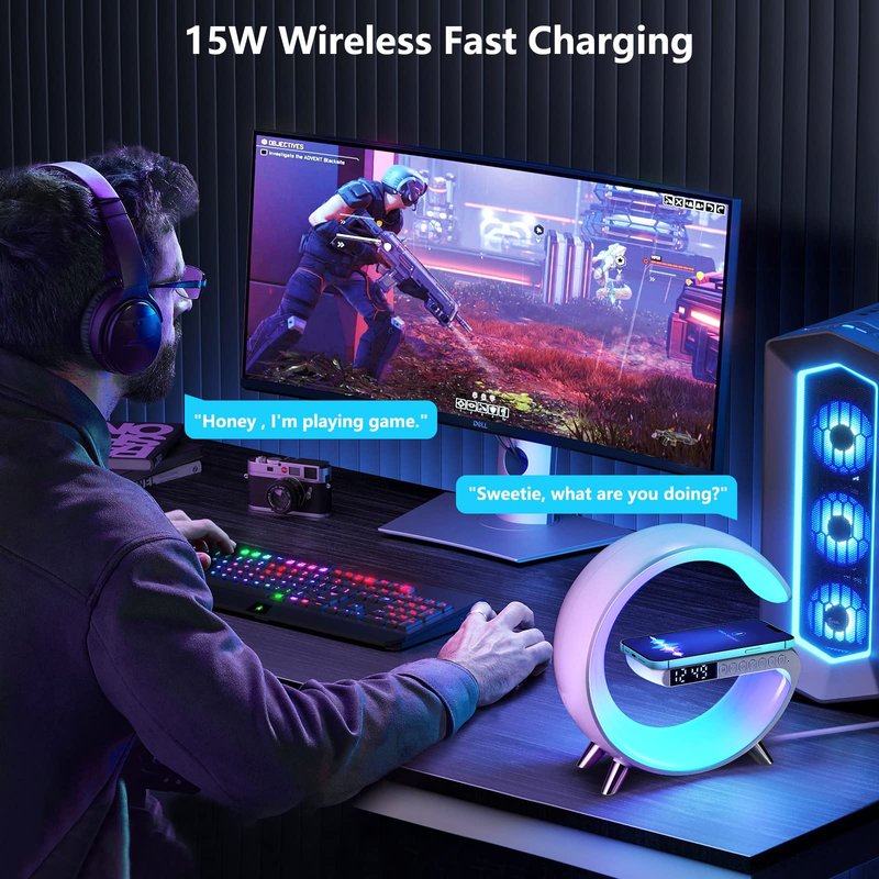 - 💎💎💎 4 in 1 Multifunctional Wireless Charging Atmosphere Light: The lamp is not only an atmosphere light, but also has 15W fast wireless charging, Bluetooth speaker, music, sleep light, atmosphere light, bedside light, glare effect, Bluetooth audio, clock, alarm clock and other functions . You can use this great light while working, studying, reading and sleeping.