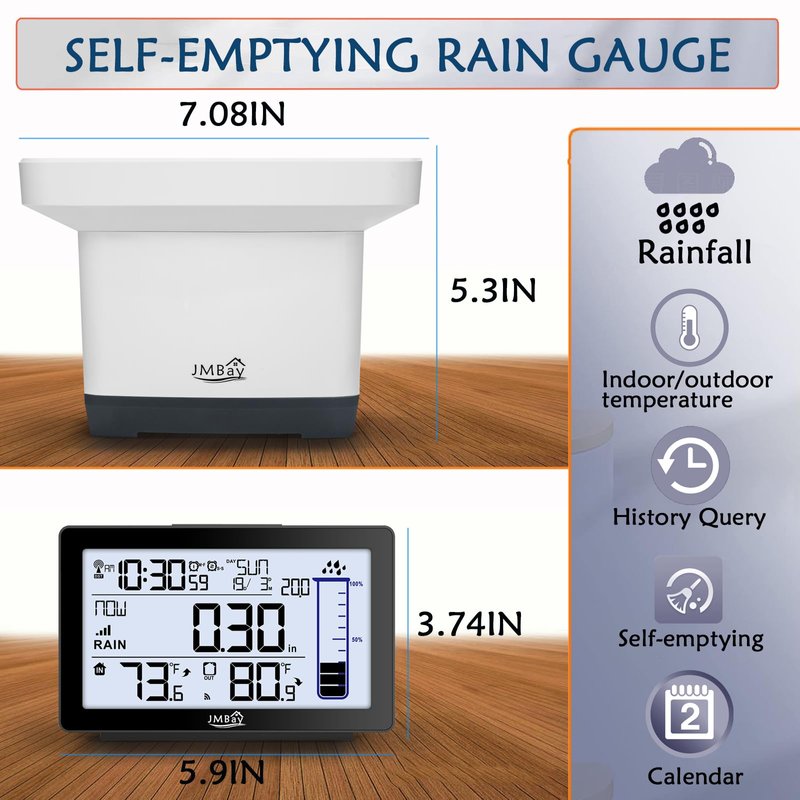 - Multi Function Rain Gauge weather station---In addition to rainfall monitoring, this digital rain gauge can also provide real-time indoor and outdoor temperatures, WWVB Radio control time function. What’s more, dual alarm clock with snooze function and calendar is practical in your usual life. Functional and stylish, JMBay rain gauge weather station is the perfect decoration for your living room, bedroom, office, greenhouse, tent, and more.