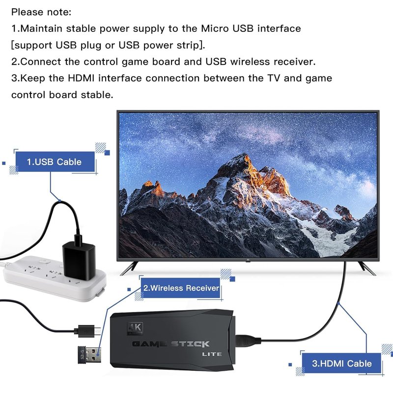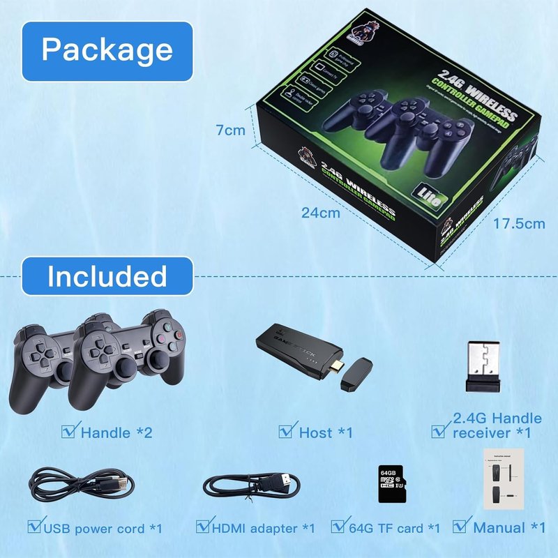 - 🎮【Plug & Play Retro Game Console Stick】Connect the gamepad to the power supply, then plug it into the TV, and adjust the TV power to the HD channel to display the game list screen on the TV. The steps are as follows :1. Connect the HD output of the TV 2. Insert the built-in TF game content card 3. Using the charging adapter to connect the power supply will turn on automatically. (2 wireless controllers require 4 AAA batteries, not included in the package)