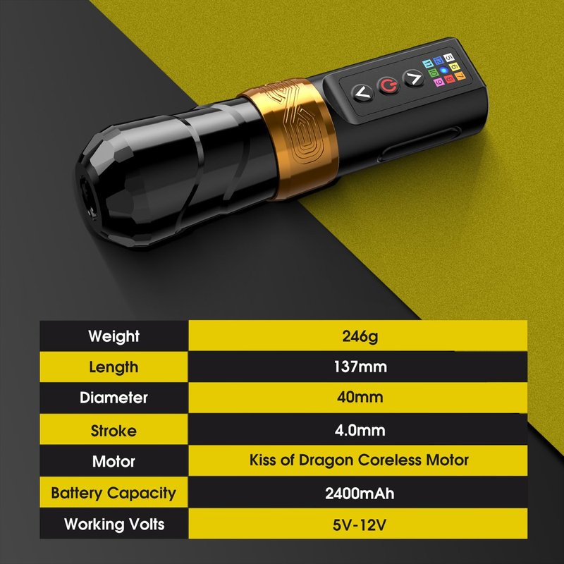 This battery pen has powerful motor precisely paired with 4.0 stroke. 42mm grip makes you more comfortable at work, of course, it can be used with all major cartridge brands as well as Kiss of Dragon cartridge system. Our tattoo pen machine adopts steel ball rotation adjustment structure to adjust the needle more accurately.