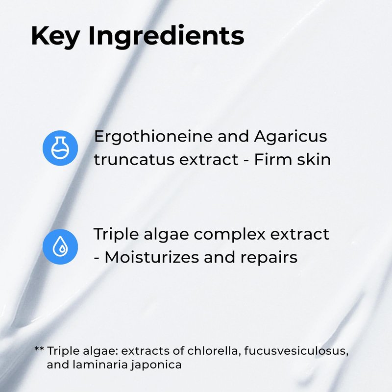 - Key Ingredient: Ergothioneine and agaricus truncatus extract to firm skin, triple algae complex extract to moisturizes and repairs, perfect for dehydrated, damaged skin and with fine lines.